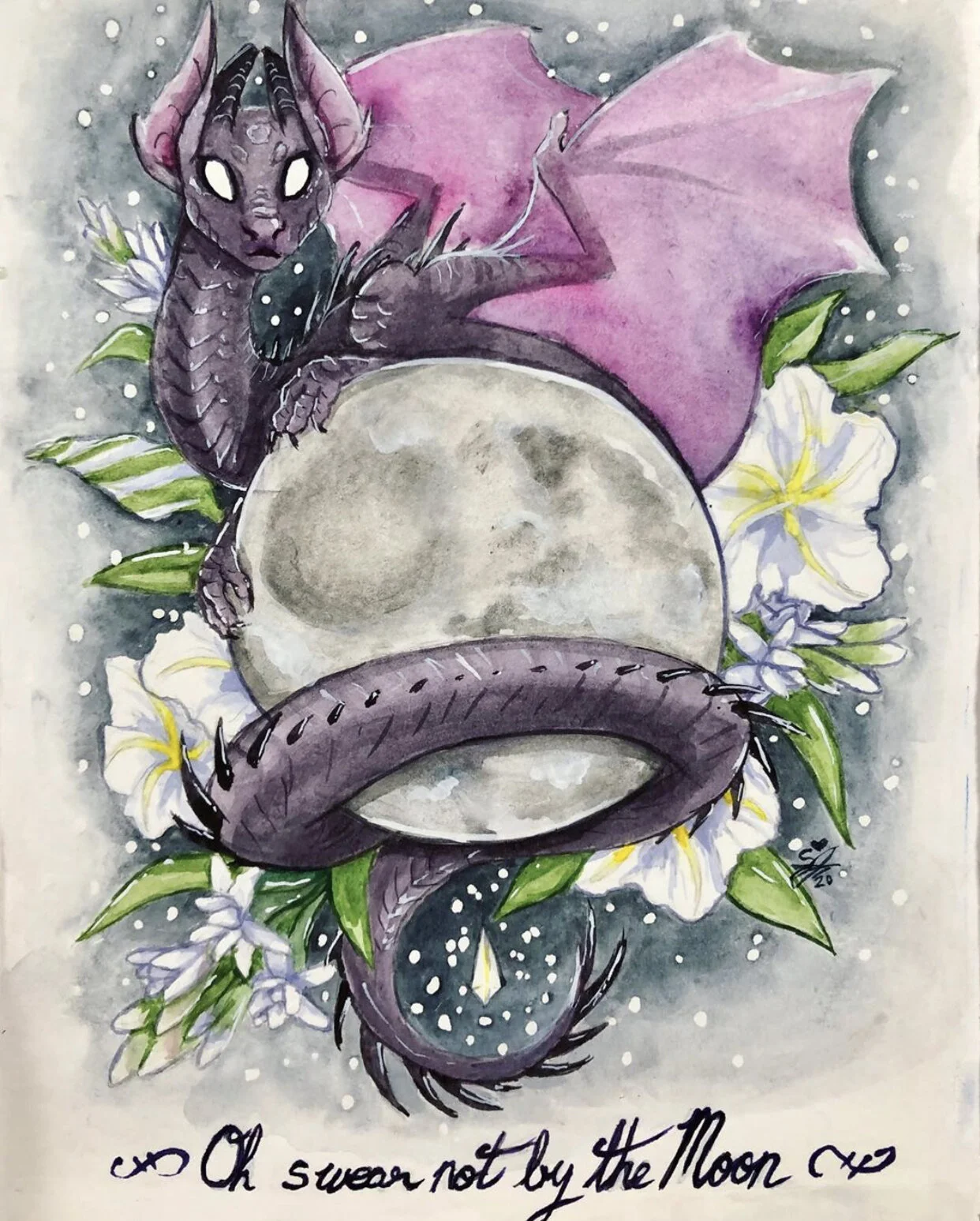 A Watercolor dragon with the text "Oh swear not by the Moon" inspired by the lyric from the song 'Not By The Moon" by GOT7.